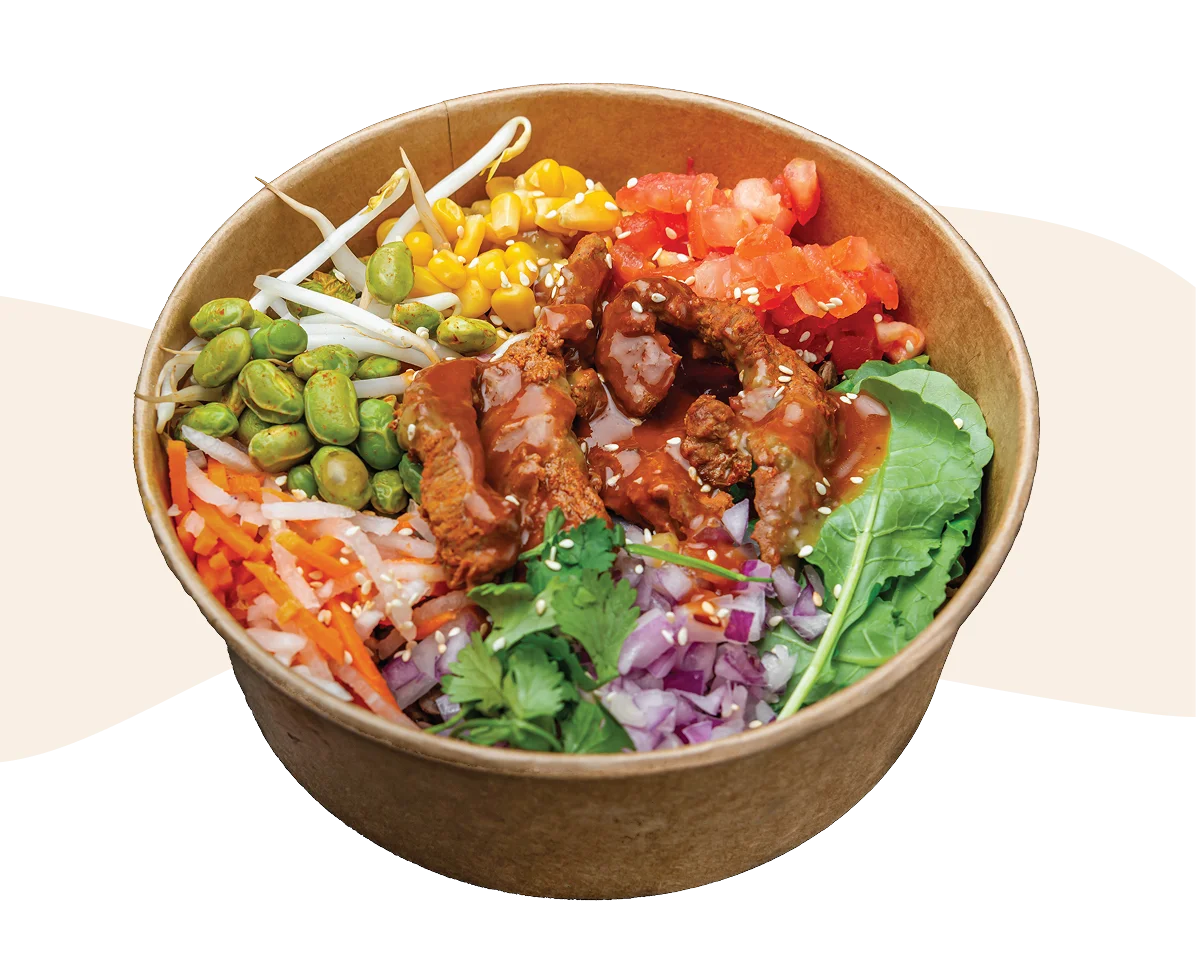 Options de protéines : Poulet thaï végétalien biologique, porc rôti, steak ou filet de poulet