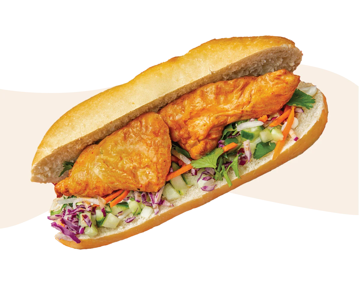 Nos BANH MIs signature sont garnis de : Sauce SKY Umami, concombre, chou rouge, coriandre, daikon mariné et carotte, servis sur une baguette française fraîche.